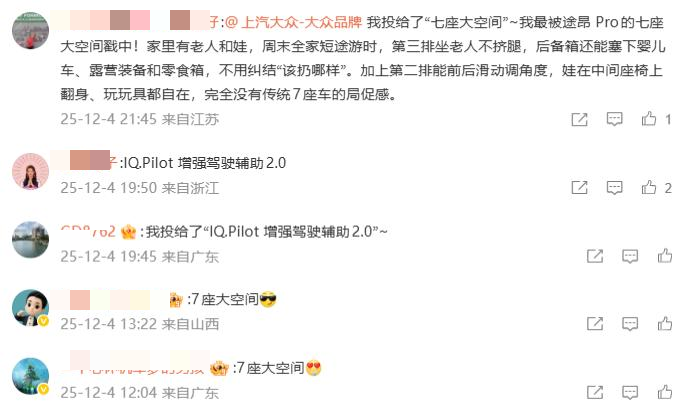 在评选互动中,“七座大空间”与“IQ.Pilot增强驾驶辅助2.0”成为网友投票关注的两大焦点。不少用户留言支持途昂 Pro的大空间:“家里有老人和小孩,周末全家出游时,第三排坐老人不挤腿,后备箱还能放下婴儿车、露营装备,不用再纠结该扔哪样。”同时,IQ.Pilot增强驾驶辅助系统2.0凭借“实时感知路况,人机共驾更安心”的出色体验,获得大量网友的选择,成为高票人气配置之一。真实用户的声音,印证了途昂 Pro在实用与科技感层面的双重吸引力。