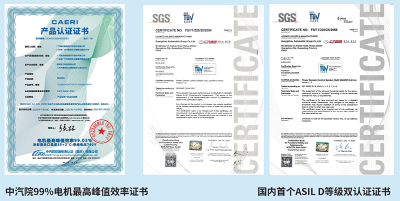 同时值得一提的是,广汽非晶合金电驱不仅是效率之王,更是安全标杆。一举斩获国内首个由DAkkS机构认可的深度集成ASIL D(汽车功能安全ISO 26262标准中的最高安全完整性等级)——功能安全与信息安全双认证,为用户构筑起“硬件+软件”双重保障的隐形安全护盾。安全是电驱系统设计的核心前提,材料选择与系统集成都应服务于整车的可靠性与用户安全。